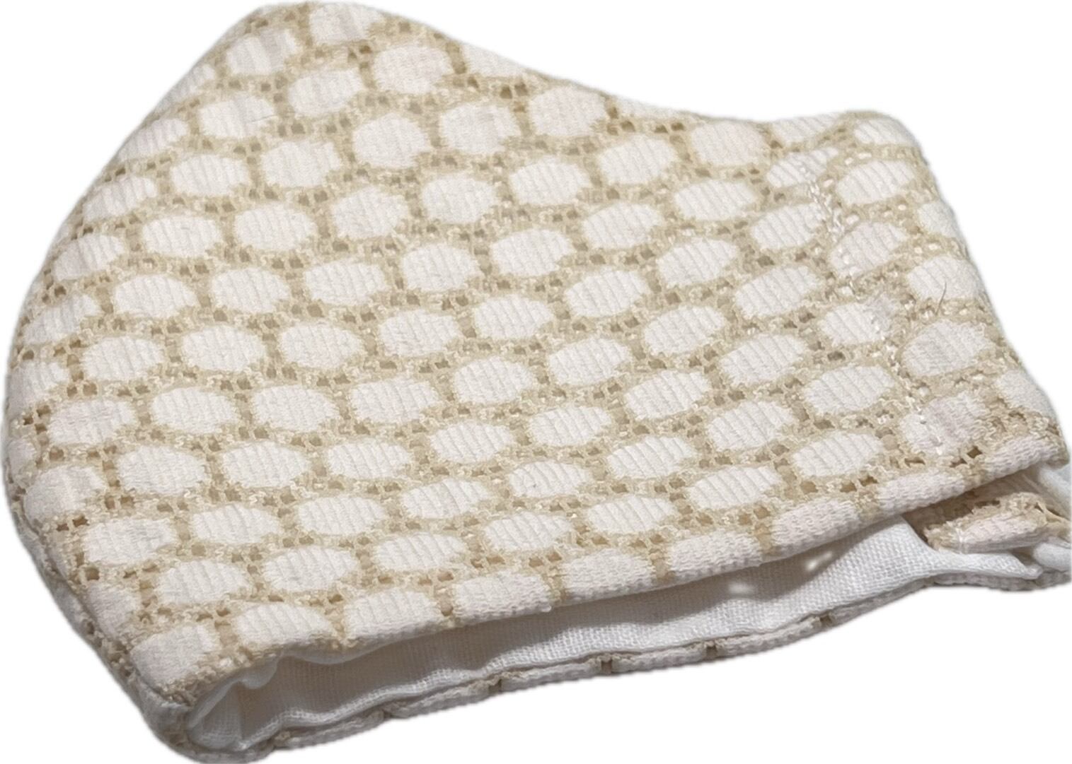 かわいらしい丸いドットレースがあしらわれた「丸いドットレースとガーゼのマスク」が新登場しました!鼻から顎までしっかりと14cmのサイズで、顔全体をスッポリ隠すデザインが特徴です。横幅は22cmです。柔らかなガーゼ素材と通気性の良い構造で、熱が籠もらず快適にご使用いただけます。