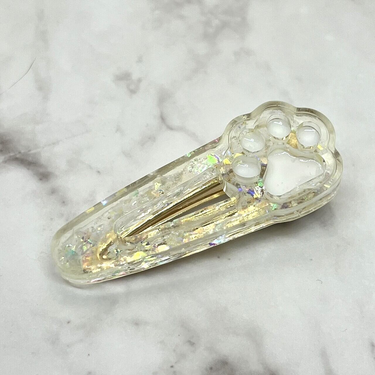 ラメをふんだんに使った透け感のある肉球ヘアクリップです。