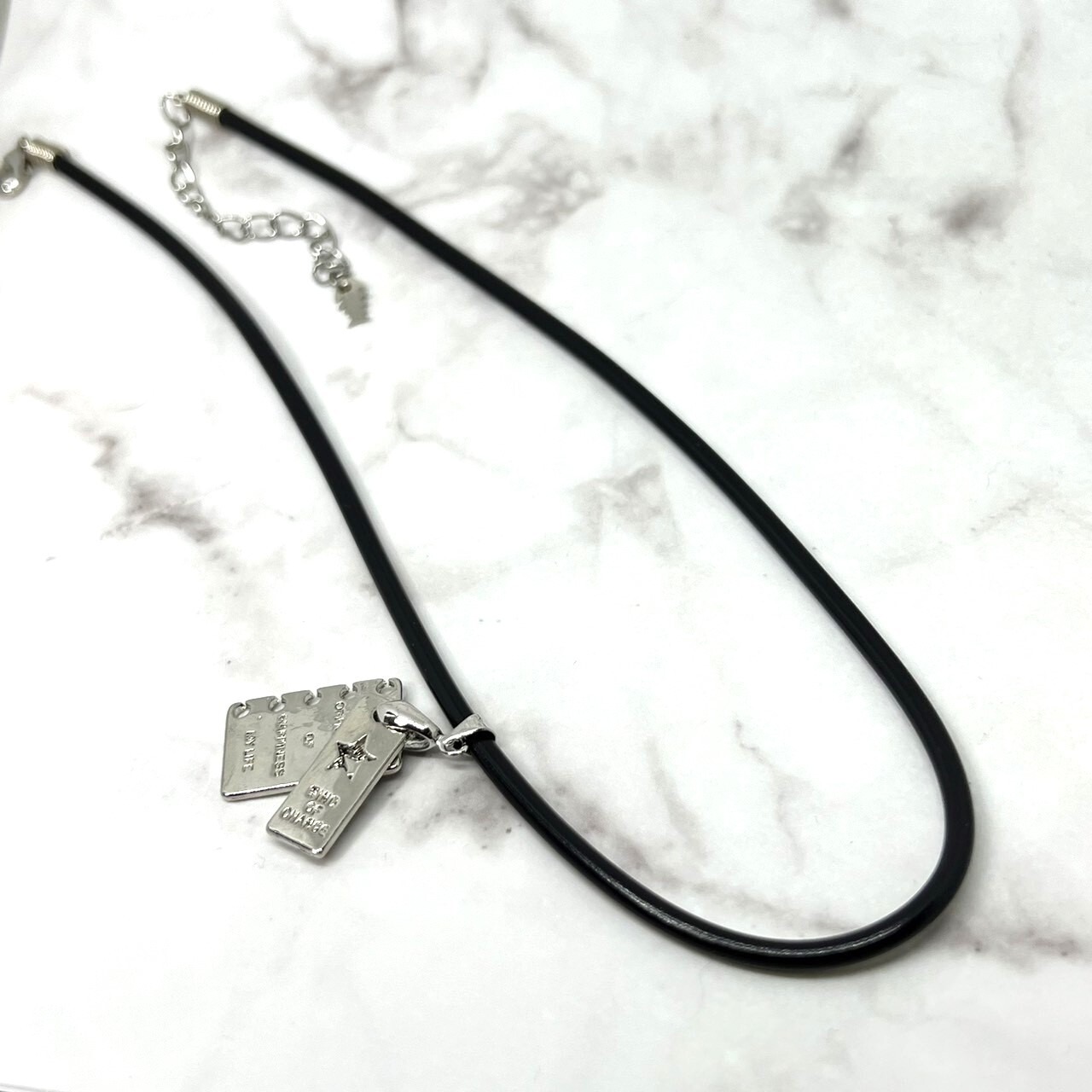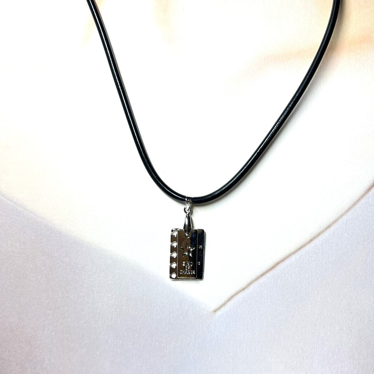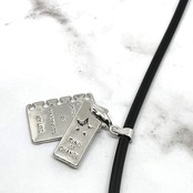 革紐のネックレスにシルバーのタグのようなメッセージプレートが絶妙に組み合わさった一品!